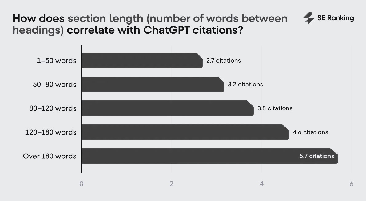 - Rašykite trumpais ir aiškiais sakiniais, tiksliai atskleiskite temą. Paprasta, tiesioginė kalba leidžia DI modeliams tiksliau identifikuoti pagrindines mintis ir panaudoti jas atsakymuose be interpretavimo klaidų. Taip pat 2025 m. SE Ranking tyrimas rodo, kad teksto sekcijų išsamumas irgi yra svarbus AI modelių citavimo faktorius. Ilgesni sekcijų tekstai, virš 180 žodžių, yra kelis kartus dažniau mini DI įrankių atsakymuose.
