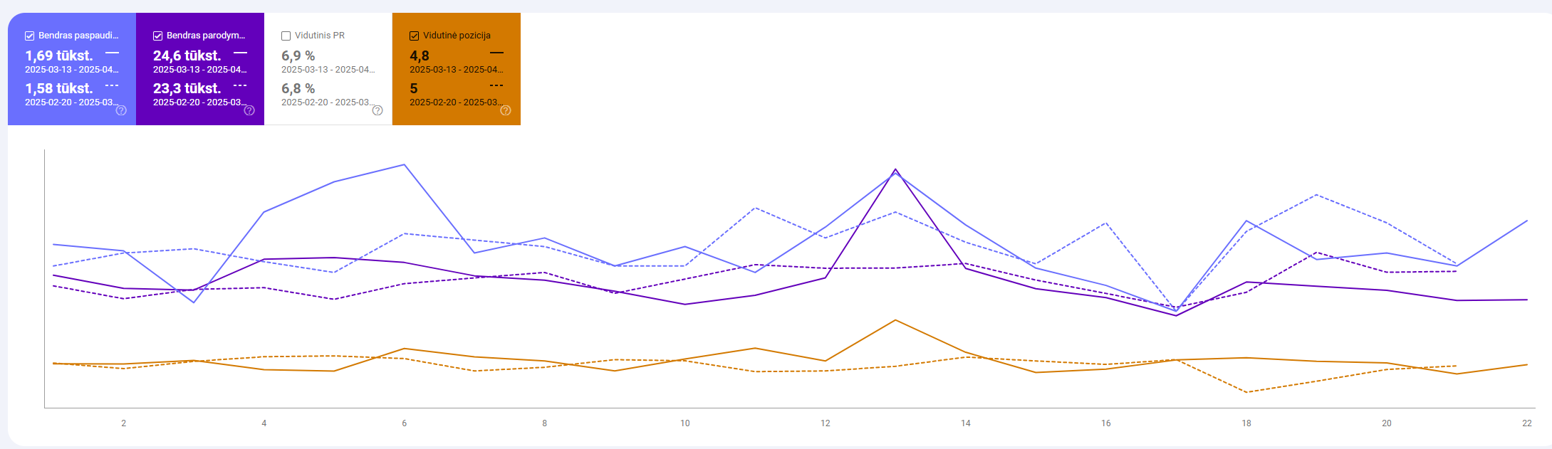 Imame laikotarpį nuo Google core update išleidimo 2025-03-13 iki savaitės po Google core update įdiegimo 2025-04-03 bei lyginame su prieš tai buvusiu laikotarpiu 2025-02-20 — 2025-03-12. Matome, kad po atnaujinimų pakilo vidutinė pozicija per 0,2 bei paaugo paspaudimai ir parodymai. Tokiu atveju nereikia imtis jokių išskirtinių veiksmų, nes po atnaujinimų rezultatai net pagerėjo.